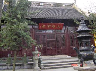 布局跟一般寺院大同小异,山门、天王殿、三佛殿(大悲殿)、大雄宝殿都依中轴线而建。天王殿大门两侧楹联“解脱门开谁肯入;浮生梦觉自知归”,八十年前由持松法师撰书,现由曹大铁重书。殿内当门而坐的是袒腹露脐、笑口常开的弥勒佛像;两厢是“风、调、雨、顺”四大天王像;弥勒佛背后是面对大殿的护法韦驮塑像。三佛殿内莲座上趺坐的是观音、文殊、普贤三大士。“大雄宝殿”匾原为清代陶浚宣书,亦毁于“文革”,现为田桓补书。大殿里高高的莲花宝座上三尊佛祖——释迦牟尼如来佛、药师佛和阿弥陀佛,金身趺坐,妙相庄严,阿难、迦叶分立两旁。大殿东西两壁十八罗汉,形神各异,栩栩如生;三佛祖身后背壁上是鳌鱼观音和海岛诸神浮雕,七彩斑斓。大殿香案上终日烛火长明,青烟袅袅,清净佛地,香气弥漫。殿柱上有楹联二,一联是“愿尽未来,普代法界一切众生,备受大苦;誓舍身命,弘护南山四分律教,久住神州。”沙门弘裔(弘一)撰书。另一联是“破宇宙人生大谜,舍我佛谁敢置喙;证实相色空真理,在诸仁自觉皈心。”持松法师撰书。大殿后门内地上有一块隆起于地面的岩石,大如伏牛,纹筋纵横,这就是“兴福石”。导游至此每每止步,讲解此石来历,于是游客俯身抚摸,希望能沾点福气。