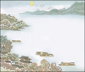 秋夜,月光下的洞庭湖水清澈空明,与明朗的月色交相辉映。湖面风平浪静,波光闪动,像一面没有磨过的镜子。远远望去,湖中翠绿的洞庭山,多像白色银盘中一只小巧玲珑的青螺呀。
