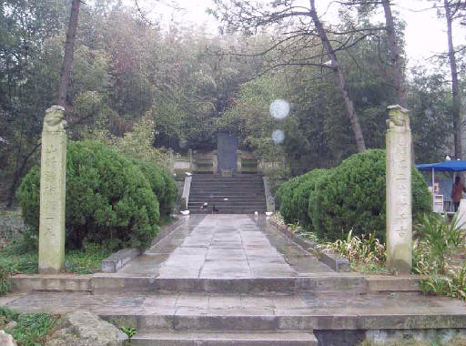 弃舟登山,可先谒“舜帝二妃之墓。”墓两边的石刻对联是:“君妃二魄芳千古,山竹诸斑泪一人。”这“泪一人”典出:虞舜南巡,崩于苍梧,他的两个爱妃娥皇和女寻夫来到洞府山,忽闻噩耗,悲痛万分,遂攀竹痛哭,泪血滴在竹子上,竟成斑竹。二妃因悲恸而死于君山并葬此。