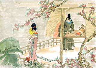 词名《相见欢》咏的却是离别愁。此词写作时期难定。如系李煜早年之作,词中的缭乱离愁不过属于他宫庭生活的一个插曲,如作于归宋以后,此词所表现的则应当是他离乡去国的锥心怆痛。起句“无言独上西楼”,摄尽凄惋之神。“无言”者,并非无语可诉,而是无人共语。由作者“无言”、“独上”的滞重步履和凝重神情,可见其孤独之甚、哀愁之甚。本来,作者深谙“独自莫凭栏”之理,因为栏外景色往往会触动心中愁思,而今他却甘冒其“险”,又可见他对故国(或故人)怀念之甚、眷恋之甚。“月如钩”,是作者西楼凭栏之所见。一弯残月映照着作者的孑然一身,也映照着他视线难及的“三千里地山河”(《破阵子》),引起他多少遐想、多少回忆?而俯视楼下,但见深院为萧飒秋色所笼罩。“寂寞梧桐深院锁清秋”,这里,“寂寞”者究竟是梧桐还是作者,已无法、也无须分辨,因为情与景已妙合无垠。过片后“剪不断”三句,以麻丝喻离愁,将抽象的情感加以具象化,历来为人们所称道,但更见作者独诣的还是结句:“别是一般滋味在心头”。诗词家借助鲜明生动的艺术形象来表现离愁时,或写愁之深,如李白《远离别》:“海水直下万里深,谁人不言此愁古”;