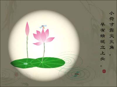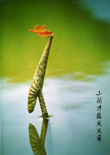 三、四两句,诗人好像一位高明的摄影师,用快镜拍摄了一个妙趣横生的镜头:“小荷才露尖尖角,早有蜻蜓立上头。”时序还未到盛夏,荷叶刚刚从水面露出一个尖尖角,一只小小的蜻蜓立在它的上头。一个“才露”,一个“早立”,前后照应,逼真地描绘出蜻蜓与荷叶相依相偎的情景。