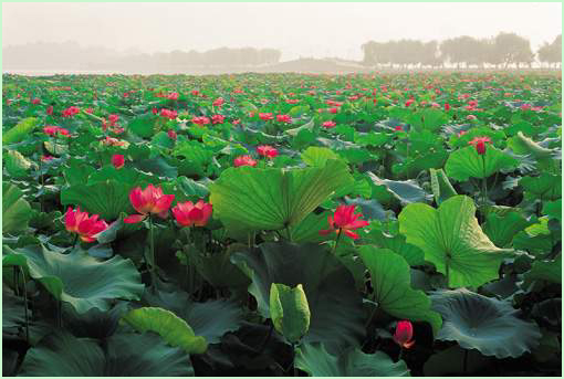 到底是西湖的六月啊,山水风光与其它季节真是不一样。湖面上铺满了荷叶,青翠碧绿,一望无际,好像与蓝天连成一片。盛开的荷花,在早晨灿烂的阳光映照下,特别红艳明亮,美丽动人。