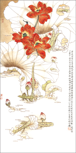 这是一首描写西湖六月美丽景色的诗,这首诗是诗中有画,画中有诗的典范作品。诗人在六月的西湖送别友人林子方,诗人的中心立意不在畅叙友谊,或者纠缠于离愁别绪,而是通过对西湖美景的极度赞美,曲折地表达对友人的眷恋。诗人开篇即说毕竟六月的西湖,风光不与四时相同,这两句质朴无华的诗句,说明六月西湖与其它季节不同的风光,是足可留恋的。然后,诗人用充满强烈色彩对比的句子,给我们描绘出一幅大红大绿、惊采绝艳的画面:翠绿的莲叶,涌到天边,使人感到置身于无穷的碧绿之中;而娇美的荷花,在骄阳的映照下,更显得格外艳丽。这种谋篇上的转化,虽然跌宕起伏,却没有突兀之感,相反,更加显示了作者驾驭文字能力的奇绝和构思的巧妙。