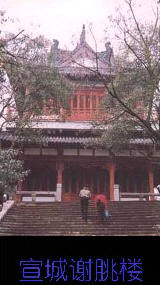 谢眺楼:又称谢公楼,也称北楼。即谢眺北楼,南齐著名诗人谢眺任宣城太守时所建,在宣城北陵阳山顶,为宣城名胜。