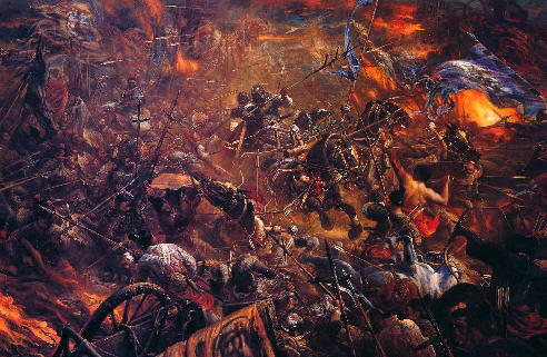 一般说来,写悲壮惨烈的战斗场面不宜使用表现秾艳色彩的词语,而李贺这首诗几乎句句都有鲜明的色彩,其中如金色、胭脂色和紫红色,非但鲜明,而且秾艳,它们和黑色、秋色、玉白色等等交织在一起,构成色彩斑斓的画面。诗人就象一个高明的画家,特别善于着色,以色示物,以色感人,不只勾勒轮廓而已。他写诗,绝少运用白描手法,总是借助想象给事物涂上各种各样新奇浓重的色彩,有效地显示了它们的多层次性。有时为了使画面变得更加鲜明,他还把一些性质不同甚至互相矛盾的事物揉合在一起,让它们并行错出,形成强烈的对比。例如用压城的黑云暗喻敌军气焰嚣张,借向日之甲光显示守城将士雄姿英发,两相比照,色彩鲜明,爱憎分明。李贺的诗篇不只奇诡,亦且妥帖。奇诡而又妥帖,是他诗歌创作的基本特色。这首诗,用秾艳斑驳的色彩描绘悲壮惨烈的战斗场面,可算是奇诡的了;而这种色彩斑斓的奇异画面却准确地表现了特定时间、特定地点的边塞风光和瞬息变幻的战争风云,又显得很妥帖。惟其奇诡,愈觉新颖;惟其妥贴,则倍感真切;奇诡而又妥帖,从而构成浑融蕴藉富有情思的意境。这是李贺创作诗歌的绝招,他的可贵之处,也是他的难学之处。(朱世英)