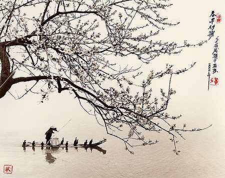 肥”,词的开篇便以热情的笔触描绘了江南春天的山光水色。西塞山前,白鹭鸟在空中盘旋,在桃花盛开的时候,湖水上涨,湖中鳜鱼欢蹦乱跳,充满生机和活力。“青箬笠,绿蓑衣,斜风细雨不须归”,最后三句推出作品中的人物——渔翁。渔翁头戴青色箬笠,身披绿色蓑衣,尽管刮着风,下着雨,但他依然垂钓,乐而忘归。“不须”二字,用语果断,表明渔翁的执着。这位渔翁在整首词中起到了画龙点睛的作用,使画面十分鲜活,成为一个有机的统一体。前边的景为他所见,水中的鳜鱼为他所想钓,当然其志不在鱼,而在于山水之乐,在于追求远离世俗的一种精神上的超脱。张志和早年为官,肃宗时曾做翰林待诏,后来坐事被贬,隐居江湖。自称“烟波钓徒”。那么词中的渔翁不就是词人的自画像吗?他是在欣赏美景,还是在欣赏自己呢?这首词的画面感极强,后世不少画家画“垂钓图”都从中受到启示。你看这里有青山、白鹭、桃花、绿水、青箬笠、绿蓑衣,色彩鲜明;又有鹭飞、花开、流水、鱼跃,极具动感,有声有色。我们知道张志和多才多艺,他本身就是位画家,对他来说诗笔就是画笔,他饱蘸情感为我们描绘了这幅极具神韵的湖山春钓图。这首词纯用白描手法,不事雕琢,质朴自然,音节响亮,富于民歌情趣。(转自“腾龙教育”)