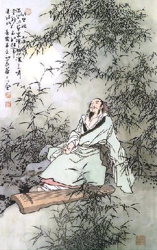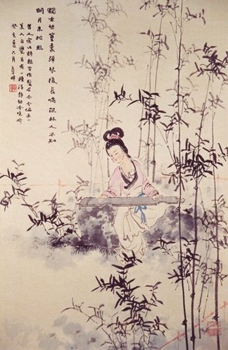 诗中写人物活动,也只用六个字组成三个词,就是:“独坐”、“弹琴”、“长啸”。对人物,既没有描绘其弹奏舒啸之状,也没有表达其喜怒哀乐之情;对琴音与啸声,更没有花任何笔墨写出其音调与声情。