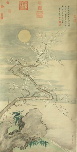 《梅花竹石图》是邹一桂85岁时创作的一幅花卉精品。该图设色纸本,纵165cm,横82.5cm。画面上碧月初升,月光铺洒在如镜的水面,大地一片空旷宁静。水边有一块坚石,石头的两边各生一株墨竹,随风摇曳。石头的上方,横生出一颗老梅,枝干苍劲有力,枝条曲折延伸,满树梅花竞相开放,表现出老梅“老而弥坚”的旺盛生命力。画面简洁、古朴,画风素雅、端庄,一看便知是宫中藏品。