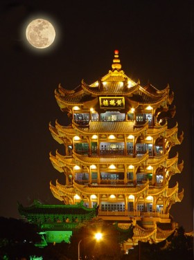 俯瞰江汉,极目千里。旧传仙人子安乘黄鹤过此,故名。此诗格调优美,最为传诵。传说李白见题诗,曾说:“眼前有景道不得,崔颢题诗在上头。”他的《登金陵凤凰台》、《鹦鹉洲》皆是模拟此诗。