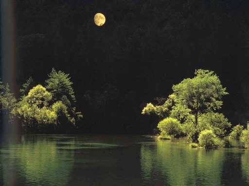 庭院中,月光洒在地下,宛如一泓积水那样清澈,那样透明,水中好似圆叶的藻草和长叶的荇草纵横交错,摇曳不定,让人看得眼花缭乱,大概那是竹叶和柏叶的蚊子吧。