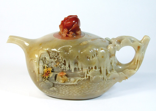 寒江独钓壶17×6.5×10CM,是寿山石雕著名工艺师林文霖先生的作品,石壶作品取材于唐代诗人柳宗元所作的《江雪》一诗,向世人展示了一幅寂静、凄寒的渔翁独钓图:空中雪花纷飞,山中无鸟兽,路上无人迹。然而就在这幽僻清冷的世界里,一位头戴斗笠、身披蓑衣的老翁,竟独自坐在一只孤零零的船上垂钓寒江!柳宗元是借描写山水景物,歌咏隐居的渔翁,来巧妙地表达自己不愿与当权者同流合污的内心世界。林文光在制作中巧妙地采用巧色处理画面,技法的多变,使作品更充满其意境,是一款可遇不可求的精品。