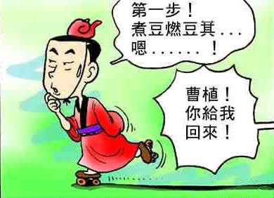 原来,曹丕和曹植都是曹操的妻子卞(音biàn)后生的。曹操不但是个政治家、军事家,又是个文学家,兄弟俩也擅长诗文,文学史上把他们父子合称为“三曹”。曹植从小聪明非凡,十几岁时候,就读了不少书,能写很出色的文章。有一次,曹操看了曹植的文章,有点怀疑,问曹植说:“这是你请人代写的吗?”