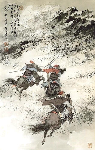 后两句写将军准备追敌的场面,气势不凡。“欲将轻骑逐”,将军发现敌军潜逃,要率领轻装骑兵去追击;正准备出发之际,一场纷纷扬扬的大雪,刹那间弓刀上落满了雪花。最后一句“大雪满弓刀”是严寒景象的描写,突出表达了战斗的艰苦性和将士们奋勇的精神。